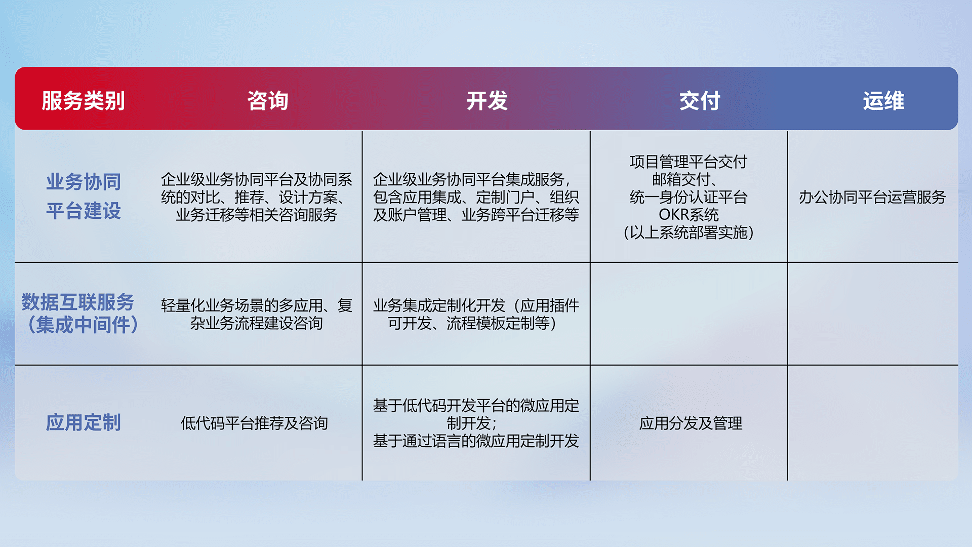 针对钉钉、、企微、、、、IDaas等平台级产品提供产品的规划、、方案、、、交付、、定制化开发等服务,,实现如统一协同办公、、、、智能客户服务、、混合会议管理、、、智能数据查询、、等业务场景,,,,实现数字化转型。。